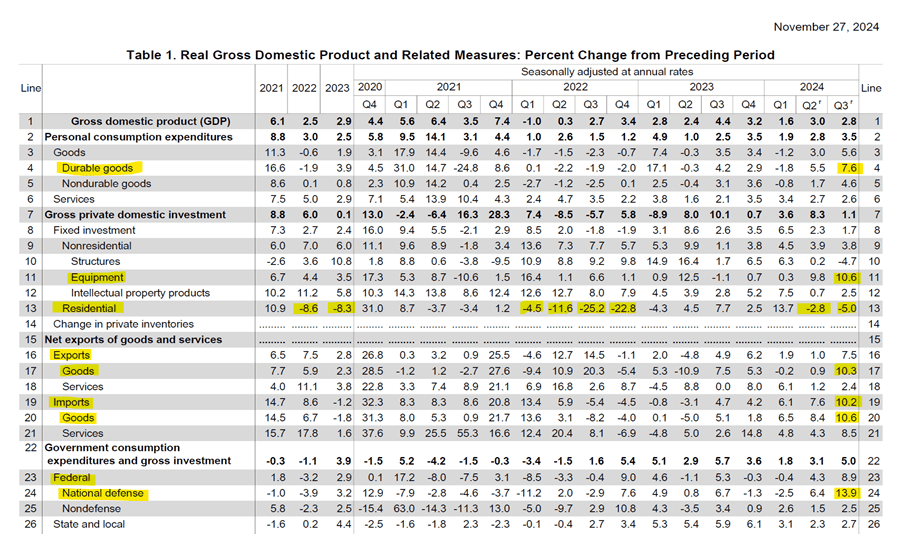 Next up, we will analyze the sources of GDP growth in detail. Judging from official US government data, personal consumption is one of the main driving forces of GDP growth. In particular, purchases of sustainable consumer goods increased by 7.6% in the third quarter of this year. Private investment focused on equipment purchases, with a growth rate of 10.6%. This verifies the trend of supply chain reshoring: setting up factories in the United States requires a lot of equipment, and the growth in equipment procurement is a direct reflection of supply chain reshoring.