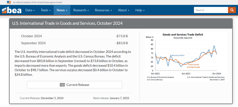 Additionally, another chart shows that the U.S. trade deficit is narrowing. In September, the U.S. trade deficit was -$83.8 billion; by October, it had decreased to -$73.8 billion. This trend indicates a reduction in the U.S.’s purchases of goods from other countries and an increase in its product exports.