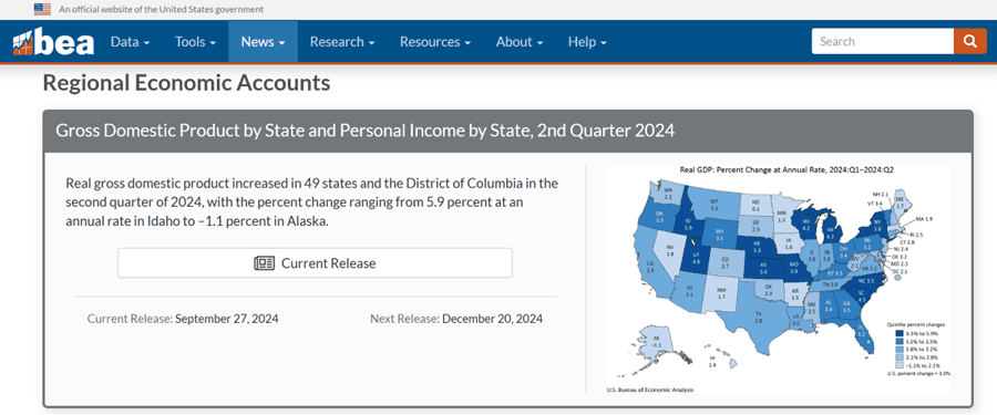 Next, let’s look at another set of data that shows GDP growth across U.S. states. The chart reveals that out of the 50 states, only one—Alaska—experienced negative GDP growth, with a growth rate of -1.1%, indicating slight negative growth. Apart from Alaska, the other 49 states all showed positive GDP growth.