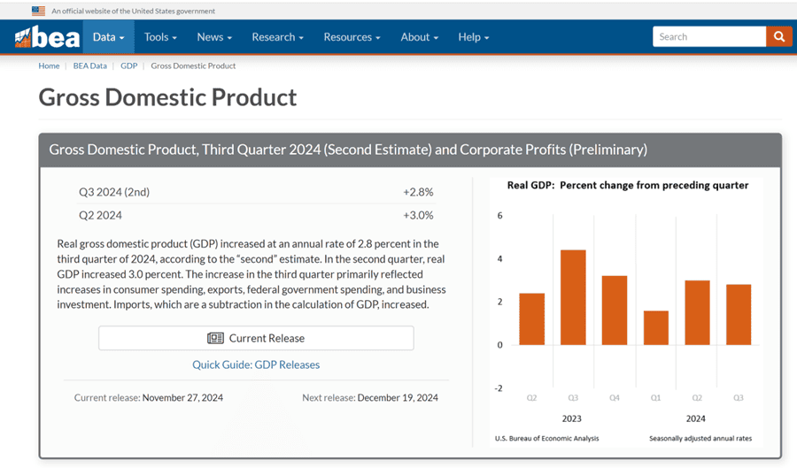 First, let’s take a look at a chart released by the US Government Census Bureau, showing GDP in 2023 and 2024. In 2023, after experiencing a strong recovery after the epidemic, the US economy showed strong growth. After entering 2024, the U.S. economy has entered a stage of sustained and stable development, and the impact of the epidemic can basically be said to have passed. Judging from the data, in the second quarter of 2024, U.S. GDP grew by 3%; in the third quarter, this growth rate was 2.8%.