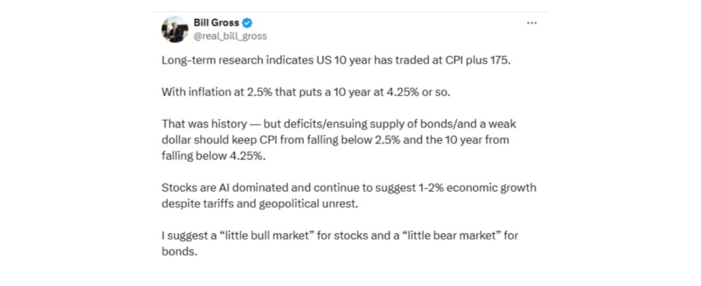Meanwhile, Gross sees little justification for a significant decline in interest rates from current levels. He points out that the 10-year U.S. Treasury yield typically runs about 1.75 percentage points above the Consumer Price Index (CPI), and is currently hovering around 4.3%, indicating limited room for further drops in bond yields.