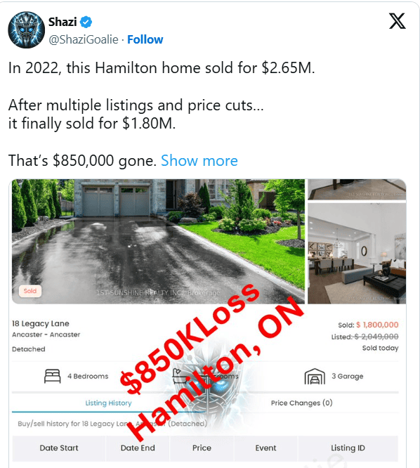The Canada housing market decline is no longer theoretical—it is now visible in real transactions. A recent home sale in Ancaster, Hamilton (18 Legacy Lane) has drawn significant attention as a clear example of how quickly property values can reverse.