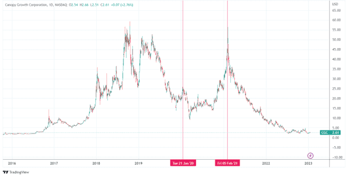 A few years ago, cannabis stocks were extremely popular with impressive gains. Imagine someone used their TFSA to buy $57,500 worth of CGC stock in early 2020, totaling 2,400 shares. By early 2021, their account could be worth $100,000. Feeling optimistic, they might decide to hold onto the stock, expecting further gains. Unfortunately, if the stock price plummets and their TFSA account balance drops to $6,000, they may decide to cut their losses and withdraw the remaining funds. In this case, the TFSA contribution room would shrink due to the losses from the stock sale.