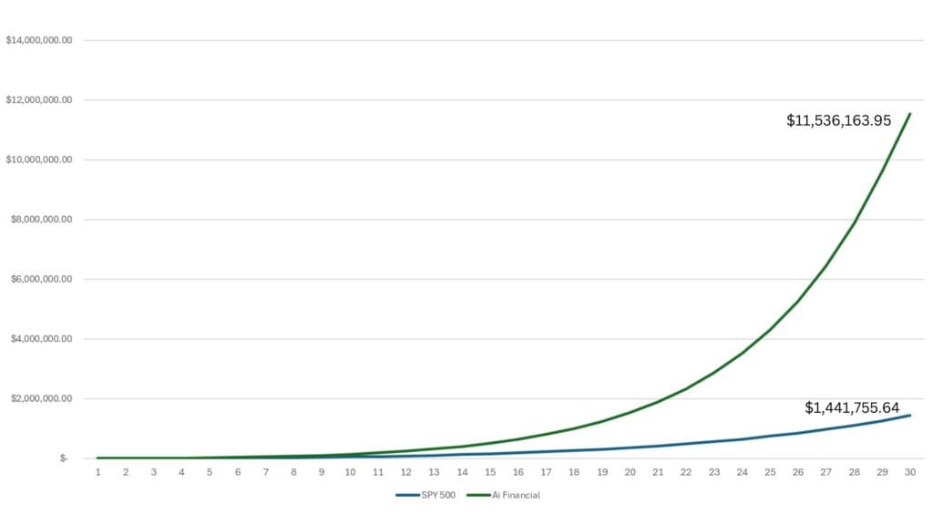 The chart below illustrates the returns of the S&P 500 Index and AiF over 30 years, showing potential outcomes: